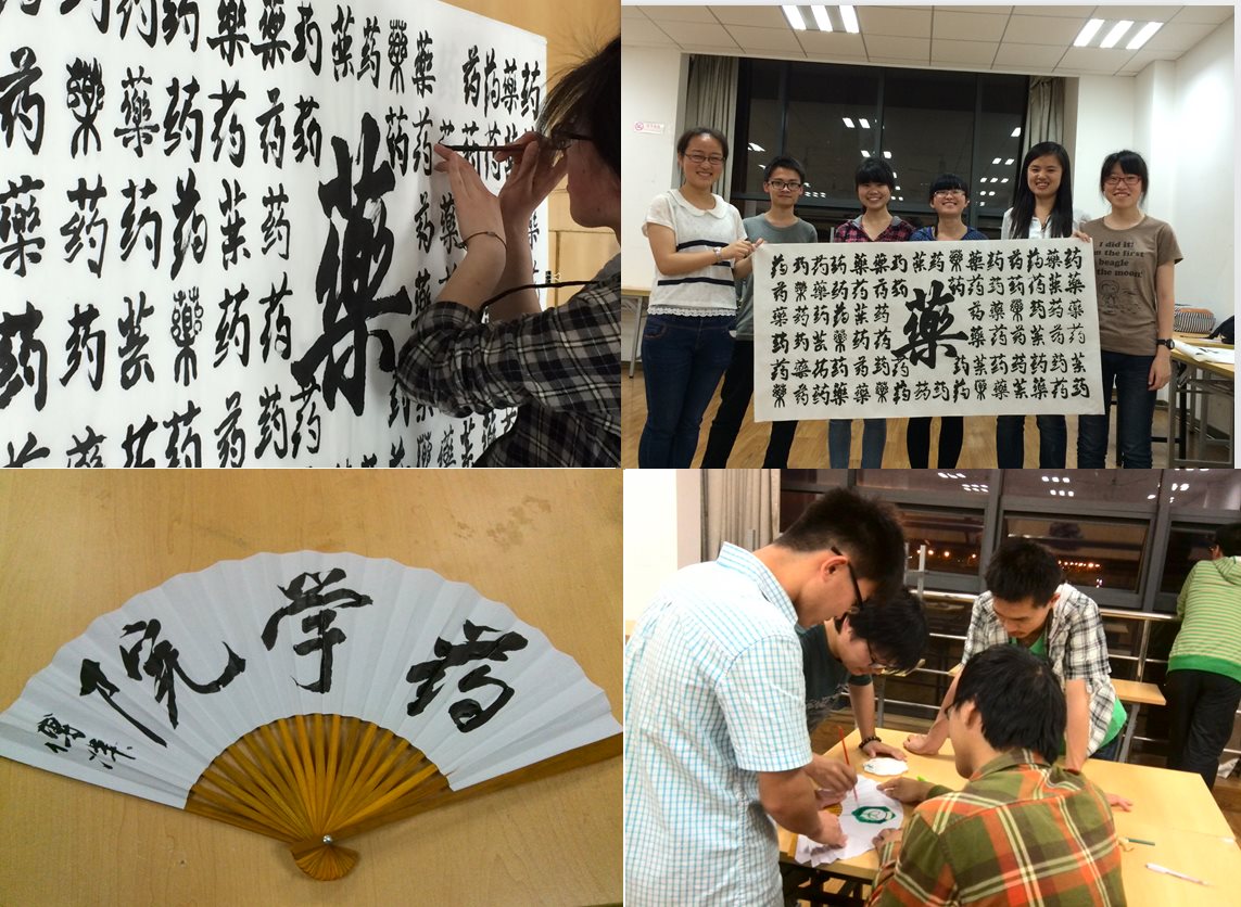 为了更好的表达对学院的祝福,学生代表进行了百药图的创作,各班有一定书法基础的同学根据自己的特色共同书写下了“药字”,寄托了对学院的情感。同时还以院庆为主题进行了扇面DIY的活动,和“药”有关的各种元素跃然与扇子之上。
