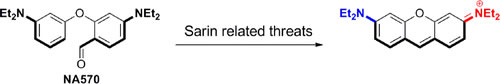 荧光信号的开关机制是探针的设计关键,杨有军副教授课题组一直致力于开发新的荧光探针调控机制,即让待测底物触发一个级联反应,并在检测体系中原位生成荧光染料的推拉电子共轭骨架,他将该方法命名为“共价组装法”。相比于目前应用广泛的光物理调控思路,或者其它经典的对染料进行化学修饰的探针设计方法,“共价组装法”的一个优点是此类探针给出的是一个从零背景增强的荧光信号,检测的灵敏性极高。基于该思路,杨有军副教授最近设计了一个可检测沙林类似物的小分子荧光探针,相关结果“A concise colorimetric and fluorimetric probe for sarin related threats designed via the “covalent-assembly” approach”发表在J. Am. Chem. Soc. (//pubs.acs.org/doi/abs/10.1021/ja502945q)。