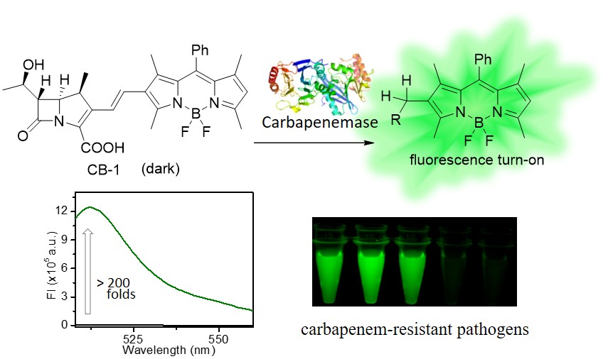 对于抗生素耐药病菌的快速检测和监控对于抗生素的合理应用和相关疾病的控制都有着非常重要的作用。针对碳青霉烯耐药菌中所特有的碳青霉烯酶能够快速水解、破坏碳青霉烯抗生素这一特点,此次研究开发出来一种能够对病菌中的碳青霉烯酶进行快速响应的荧光探针CB-1。这一探针在结构上模拟了碳青霉烯抗生素的特点,因此能够被病菌中的碳青霉烯酶快速水解从而增强荧光信号,而对其它功能相似的beta-内酰胺酶则基本没有响应,具有出了非常好的检测特异性。探针分子自身基本没有荧光,当探针分子被酶快速水解后能够发出强绿色荧光信号,最高荧光增强倍数在200倍以上。因此,通过对检测样品的荧光强度进行测定即可实现对碳青霉烯耐药菌的快速检测。这一荧光探针具有检测准确度高,检测灵敏等一些优点,在耐药病菌的快速检测和相关疾病的诊断中具有较好的应用前景。