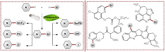 硅元素的引入,可有效增强药物分子的脂溶性和透膜能力,代表着一种有效的新药研发策略。该教授团队长期致力于绿色高效自由基交叉去氢偶联反应技术的开发,通过碳碳键构建,实现了多种药物骨架的有效合成(Chem. Sci. 2016, 7, 2111; Chem. Sci. 2017, 8, 4044)。最近,该团队将相关技术扩展至碳硅键构建之中,发展了一类可见光催化的芳杂环碳氢键硅化反应,在绿色温和条件下,实现了芳杂环上三烷基硅基的快速引入。通过进一步研究,还成功激活了产物与多种硅基偶联反应的兼容性,为复杂生物活性分子高效合成和后期官能团化修饰提供了新颖实用的反应工具。