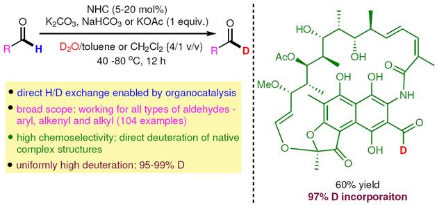 张士磊课题组几年来致力于通过平衡交换的方法把便宜易得的普通分子直接转变成具有重要合成价值的氘代分子(Org. Lett. 2019, 21, 448-452),经过大量的实验,终于在百余种NHC(氮杂环卡宾)化合物中筛选出几种优秀的催化剂,既能实现各种醛基的高氘代率(>95%),又不会使收率显著降低。最终确定的反应条件非常温和,对各种醛基(包括芳醛、烯醛和脂肪醛)的氘代都有效,但是又不会影响其它官能团,所以底物兼容性极其高,甚至复杂的天然产物分子比如3-甲酰利福霉素、麦迪霉素和糖类(半缩醛)都可以被选择性氘代,这是其它任何方法都没办法做到的。该氘代反应可以在空气中进行,使用的NHC催化剂只需要从价格低廉的工业原料经2-3步反应大量制备,氘源是氘代物中最普通的氘水。如果一次氘代不能满足需求,还可以进行二次氘代,直至氘代率>99%。反应在放大至30 mmol级别时无任何氘代率和收率的降低。这些优点使得本方法成为目前制备氘代醛最好的实用性的选择。
