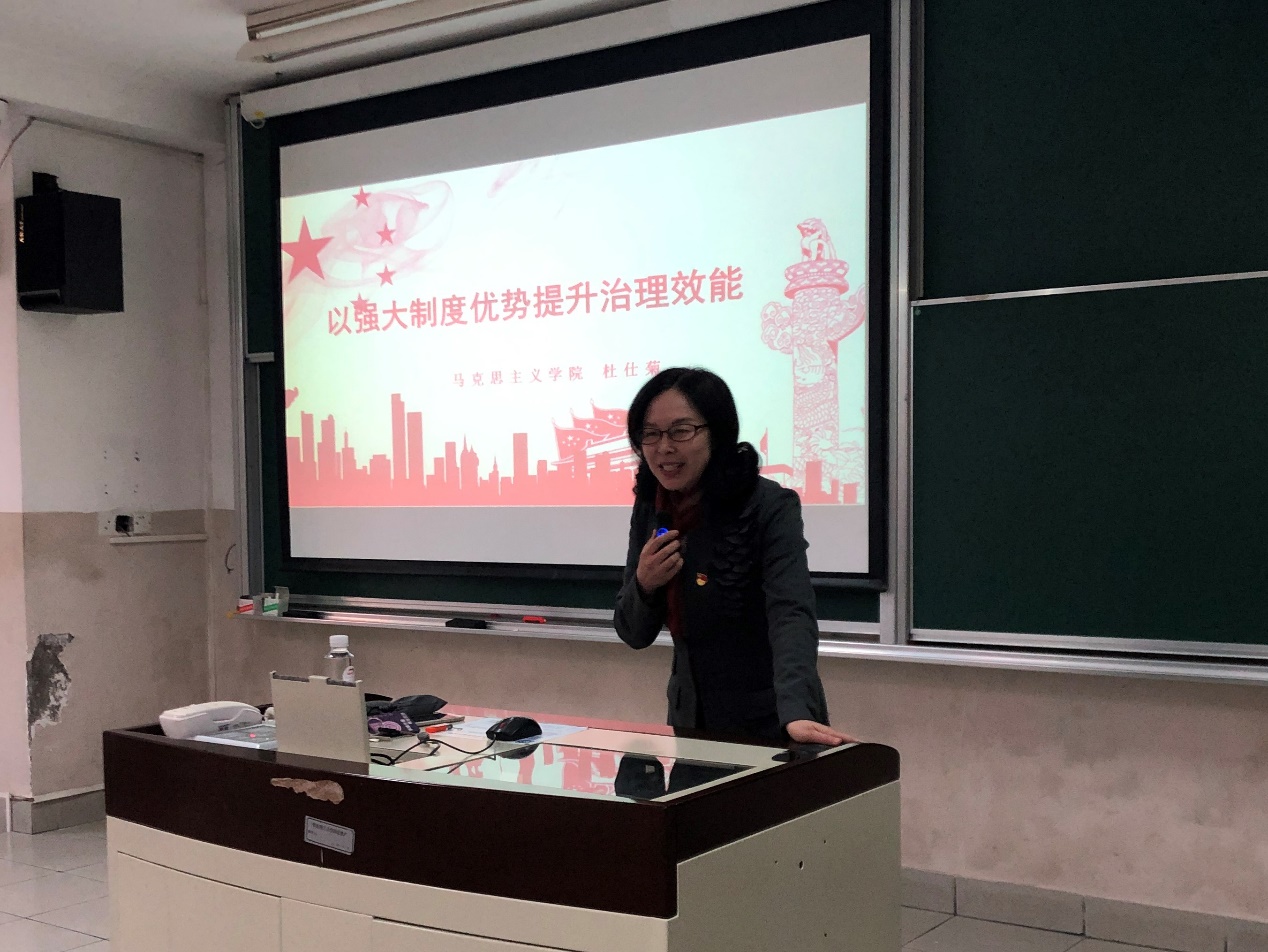 党委在四教102开展十九届四中全会精神主题学习教育专题报告会。校党的十九届四中全会精神理论宣讲团成员、马克思主义学院院长杜仕菊教授,应邀做了题为“以强大制度优势提升治理效能”的报告。吃瓜黑料网