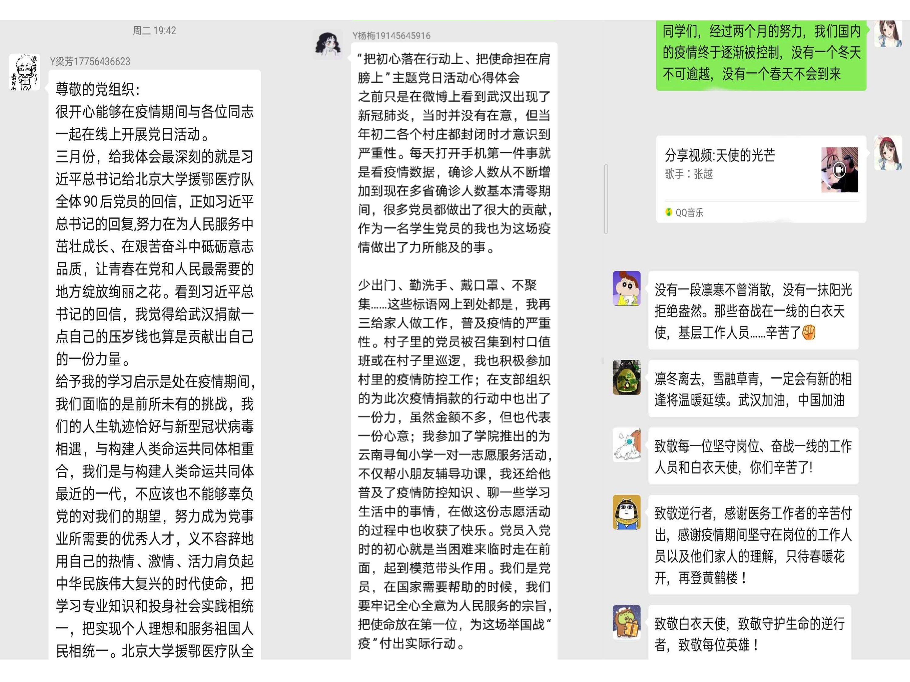 学生党员积极响应组织号召在村委、居委开展志愿服务工作,尽己所能捐款捐物。在本次党日活动中,这些在抗疫期间努力作出自己贡献的同学也都在支部内分享自己的感思,激励全体研究生党员时刻牢记为民初心,尽己所能服务社会、服务人民。也有支部以逆行医护人员、雷神山建设者、社区基层工作人员的感人事迹及习近平总书记给北大援鄂医疗队全体“90后”党员的重要回信为学习素材开展讨论。
