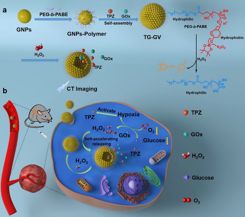 过氧化氢是细胞内众多代谢途径的副产物,主要产生于线粒体。癌细胞内的线粒体功能紊乱,在癌细胞快速增殖的过程中会持续产生大量过氧化氢。针对这一特性,朱维平与复旦大学聂志鸿教授团队合作,设计并制备了过氧化氢刺激响应型金纳米囊泡TG-GV,同时包裹乏氧前药替拉扎明(TPZ)以及葡萄糖氧化酶(GOx),实现肿瘤部位特异性释药。