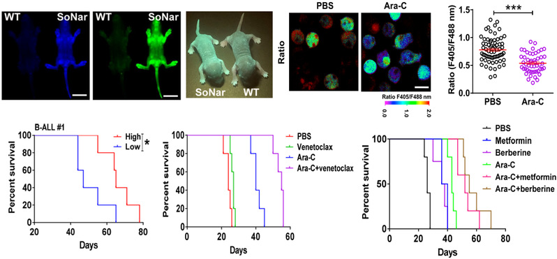 本研究利用遗传编码NADH/NAD+探针SoNar的转基因工具鼠,发现B-ALL 细胞主要以氧化磷酸化作为其主要能源(图2)。SoNar低的 B-ALL 细胞具有增强的线粒体呼吸能力,倾向于驻留在血管壁中,并且比 SoNar高的细胞中的功能性白血病起始细胞富集更多。SoNar低的细胞比SoNar 高的细胞对B-ALL一线用药 Ara-C 具有更高抵抗力。临床样本中,SoNar低的人原代 B-ALL 细胞也偏爱氧化磷酸化,并且对 Ara-C 处理有抵抗力。用 3 种药物(维奈托克、二甲双胍、小檗碱)抑制氧化磷酸化作用,无论在体内还是体外,都能很好减弱 Ara-C 诱导的耐药性(图2)。本研究为理解代谢特性与 B-ALL 细胞的命运决定之间的潜在联系以及开发针对癌症耐药性的治疗策略提供了有效的工具和独特的视角。目前针对B细胞急性淋巴细胞白血病的联合用药方案,吃瓜黑料网