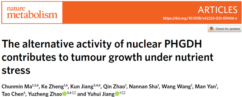 赵玉政教授团队与上海交通大学医学院附属仁济医院蒋玉辉研究员团队合作研究,深入解析了营养缺失条件下PHGDH通过核易位以及酶活转变调控细胞核NAD+和肿瘤细胞生长的分子机制。该研究成果以“The alternative activity of nuclear PHGDH contributes to tumor growth under nutrient stress”为题,在线发表在国际权威学术期刊《自然-代谢》(Nature Metabolism, 2021, doi.org/10.1038/s42255-021-00456-x)上。