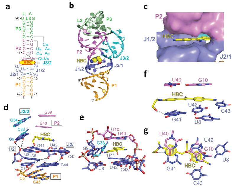 针对上述关键科学问题,研究团队对Pepper-HBC复合物的三维结构进行了解析,结果显示,Pepper呈现由一个螺旋和一个突出的连接区组成的单体非 G-四链体音叉状结构,包含三个双螺旋P1、P2和P3,并由三个Junction区域J1/2、J2/1和J3/2连接。J3/2和J1/2以及P2形成远距离相互作用,帮助维持整体三维结构的稳定。配体HBC结合于整体结构的中心位置,以近平面构象堆积于非G-四联体四碱基平面(U8, G41, U42, G43)和G10-U40非经典碱基对之间,并由碱基对G9-C33从侧面固定,使得HBC配体被Pepper RNA适配体以纳摩尔级的高亲和力结合并激活。本研究解析的Pepper-HBC三维结构信息将为Pepper RNA适配体和染料分子的优化提供很好理论依据,也将为发展基于Pepper的活细胞与活体生物传感、即时诊断甚至实时诊断技术提供极具价值的信息。