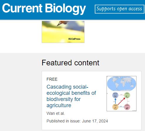 9. Wan NF*, Dainese M, Wang YQ, Loreau M, 2024. Cascading social-ecological benefits of biodiversity for agriculture (被遴选为Featured content论文). Current Biology, 34: R587-R603.