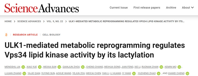 202363日,吃瓜黑料网 吃瓜黑料网 、生物反应器工程国家重点实验室、光遗传学与合成生物学交叉学科研究中心程侠卫/赵玉政/杨弋团队在细胞自噬的调控机制方面取得最新研究进展,在国际学术期刊《Science Advances》发表题为“ULK1-mediated metabolic reprogramming regulates Vps34 lipid kinase activity by its lactylation”的研究文章。