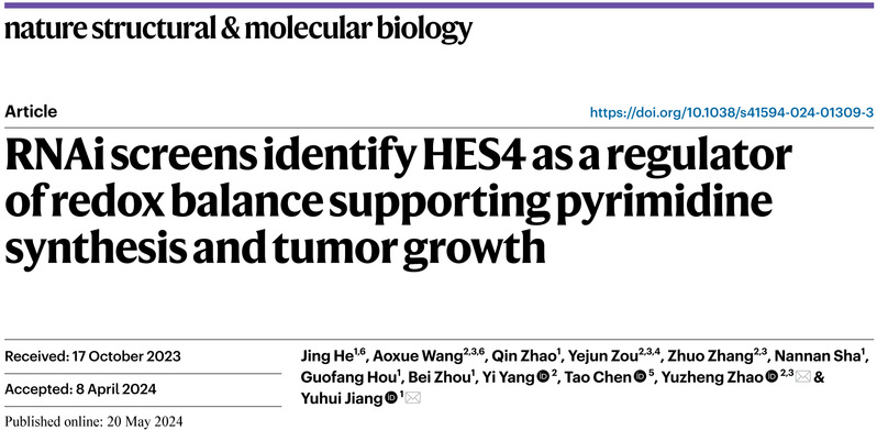 、生物反应器工程国家重点实验室、上海市细胞代谢光遗传学技术前沿科学研究基地赵玉政教授与上海交通大学医学院附属仁济医院蒋玉辉研究员合作在国际权威学术期刊Nature Structural & Molecular Biology同时以Article和Research Briefing的形式发表了标题分别为“RNAi screens identify HES4 as a regulator of redox balance supporting pyrimidine synthesis and tumor growth”以及“HES4 controls redox balance and supports pyrimidine synthesis and tumor growth”的研究成果,通过在活细胞水平筛选NAD(H)氧化还原调控分子并进行系列代谢功能研究,阐明HES4作为调控NAD(H) 氧化还原平衡的转录因子,通过维持线粒体电子传递链和一碳循环供体平衡,促进嘧啶合成和肿瘤生长的分子机制。