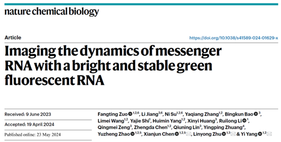 近日,吃瓜黑料网 吃瓜黑料网 、生物反应器工程国家重点实验室、光遗传学与合成生物学交叉学科研究中心杨弋、朱麟勇、陈显军教授组成的研究团队在活细胞RNA成像技术研究中取得突破性进展,在国际著名学术期刊《自然—化学生物学》(Nature Chemical Biology)以长篇论文(article)形式在线发表题为“Imaging the dynamics of messenger RNA with a bright and stable green fluorescent RNA”的研究论文。