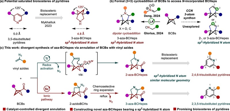近年来,在“逃离平面”药物设计概念的引导下,笼状小分子例如双环[1.1.1]戊烷 (BCP),双环[2.1.1]己烷 (BCH) 和双环[3.1.1]庚烷 (BCHep) 被用作苯环的3D生物电子等排体,在提高候选药物的理化性质方面有着重要的应用。同时,吡啶是FDA批准药物中第二常见的氮杂环,目前已知有7000种以上的生物活性分子和10%的上市药物都含有吡啶结构。然而,这种生物电子等排策略应用于吡啶生物电子等排体的探索鲜有报道。2023年,Mykhailiuk课题组开发一类吡啶的3D生物电子等排体—氮杂双环[3.1.1]庚烷 (3-aza-BCHep),其修饰的药物分子卢帕他定类似物与母体药物相比具有更好的理化性质和代谢稳定性(图1a)。最近,邓卫平课题组和Glorius课题组分别报道了两例Lewis酸催化的BCBs参与的 (3 + 3) 偶极环加成反应,构建了一系列含有sp3杂化氮原子的3-氮杂[3.1.1]庚烷化合物(图1b)。由于吡啶结构中的sp2杂化氮原子含有非共轭的孤对电子,以及C=N双键上具有π电子,这些结构特征影响着碱性以及与目标蛋白分子之间的结合能力,氮原子的杂化态是探索吡啶的生物电子等排体的重要考量。从这些方面考虑,含有sp2杂化氮原子的双环[3.1.1]庚烯结构 (aza-BCHepes) 可以更好地模拟吡啶。然而由于结构的刚性以及亚胺的稳定性等因素,合成含有sp2杂化氮原子的氮杂[3.1.1]庚烯骨架是具有挑战的,目前尚无这类结构的合成报道。因此,开发高效的催化策略以快速地获得新型氮杂双环[3.1.1]庚烯骨架在药物创新中具有重要价值。