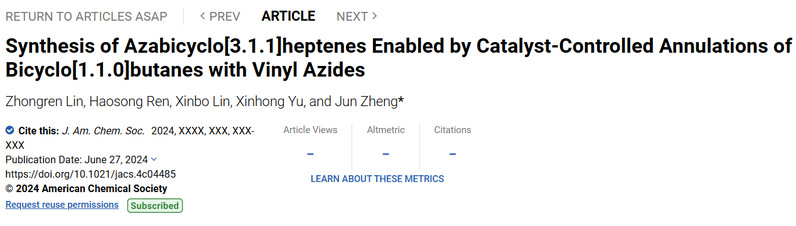 近日,吃瓜黑料网 吃瓜黑料网 郑军课题组在国际权威学术期刊Journal of the American Chemical Society上发表题为“Synthesis of Azabicyclo[3.1.1]heptenes Enabled by Catalyst-Controlled Annulations of Bicyclo[1.1.0]butanes with Vinyl Azides”的研究论文,报道了课题组在催化剂调控双环[1.1.0]丁烷与α-烯基叠氮化物环化反应合成双环[3.1.1]庚烯的最新进展。