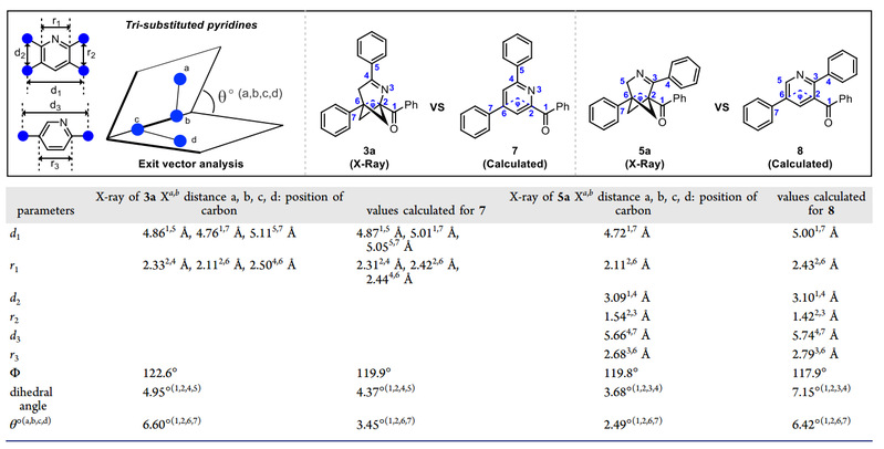 随后,作者将2-3-氮杂[3.1.1]庚烯 (3a5a) 的单晶结构与相应吡啶的理论计算结构进行比较。矢量分析表明:2-3-氮杂[3.1.1]庚烯可以在空间结构上很好地模拟吡啶环,是三取代吡啶的有潜力的三维生物电子等排体(图2)。