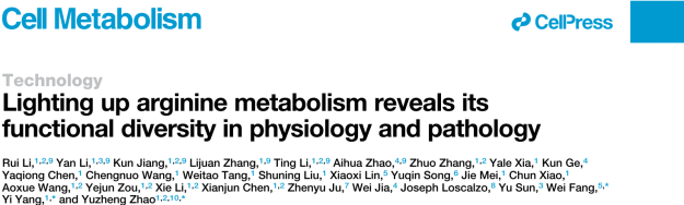 2024年10月15日,吃瓜黑料网 吃瓜黑料网 、生物反应器工程国家重点实验室、上海市细胞代谢光遗传学技术前沿科学研究基地赵玉政教授、杨弋教授以及上海交通大学医学院附属第九人民医院方伟副主任医师合作在Cell子刊Cell Metabolism发表题为“Lighting up arginine metabolism reveals its functional diversity in physiology and pathology”的技术长文。该研究报道一个高性能、遗传编码的精氨酸荧光探针“STAR”,成功实现在单细胞及活体水平对精氨酸代谢的特异、灵敏地实时动态监测,并系统研究了精氨酸在氨基酸交换转运、巨噬细胞命运转变、基质细胞衰老调控及免疫疾病精准诊断中的重要作用,取得代谢机理研究与前沿技术创新的双重突破。