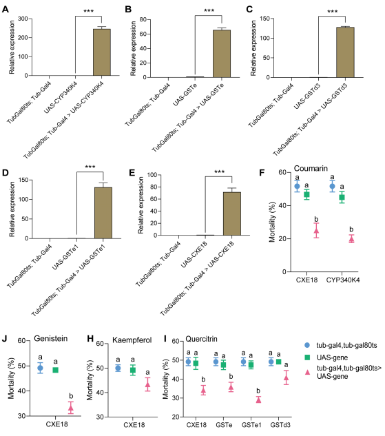 图3 甜菜夜蛾解毒酶基因在转基果蝇品系中的表达水平及次生代谢物对果蝇致死作用的影响