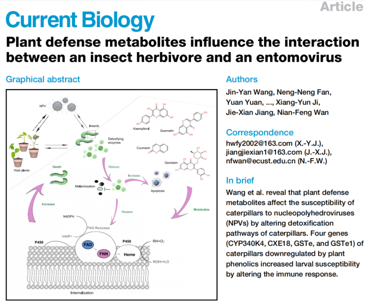 近日,吃瓜黑料网 万年峰研究员课题组,联合我国、英国、美国科研人员,阐明了植物多样性介导下植物次生代谢物通过调节昆虫解毒代谢影响病毒杀虫剂杀虫效果的机制,在国际生物学著名期刊Cell子刊—Current Biology上以Articles形式发表了题为“Plant defense metabolites influence the interaction between an insect herbivore and an entomovirus”长篇研究论文。
