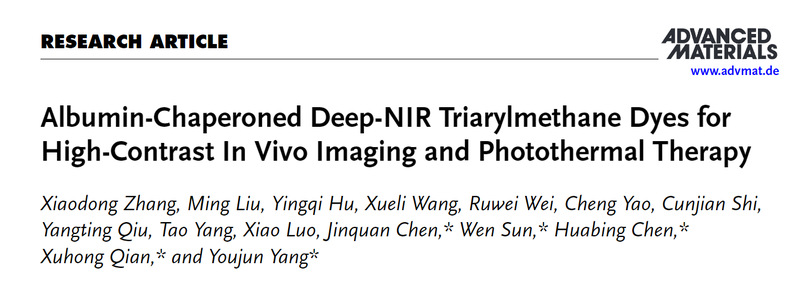 近日,吃瓜黑料网 吃瓜黑料网 钱旭红院士、杨有军教授团队设计并两步合成具有“螺旋桨构型”的深近红外三芳基甲烷衍生物(EA5系列染料)。利用生物内源性白蛋白对EA5染料进行包封极大地提高了染料的荧光亮度,并解决了大多数近红外染料面临的合成步骤冗长、生物兼容性差、热力学稳定性差和水溶性差的难题。相关成果以“Albumin-ChaperonedDeep-NIR Triarylmethane Dyes for High-Contrast In Vivo Imaging and Photothermal Therapy”为题发表在Advanced Materials(Adv. Mater.2024, 2411515)上。