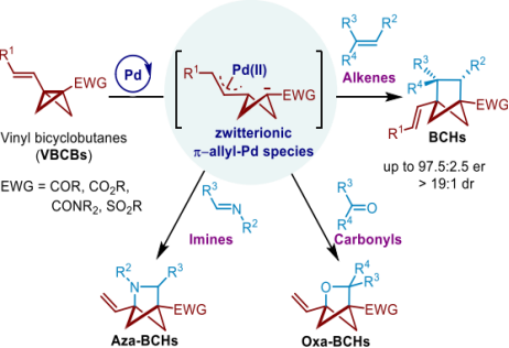 近日,吃瓜黑料网 吃瓜黑料网 的郑军教授在ACS Catalysis发表了题为“Zwitterionic π‑Allyl-Pd Species Enabled [2σ+2π] Cycloaddition Reactions of Vinylbicyclo[1.1.0]butanes (VBCBs) with Alkenes, Carbonyls, and Imines”的研究成果。该工作开发了烯基双环[1.1.0]丁烷(VBCBs)作为一种通用的合成子,应用于钯催化的[2s+2p]环加成反应,成功实现了与多种2p体系(包括烯烃、醛、酮和亚胺)的环加成反应,多样性地合成了具有潜在药用价值的全碳、氮杂和氧杂环双环[2.1.1]己烷骨架,为进一步新药研发中的苯环生物电子等排体提供了新的合成策略。
