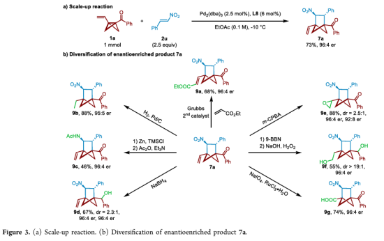 成功实现了手性BCH 7a的放大合成,收率、对映选择性和非对映选择性没有降低。对7a进行了多种转化,包括烯烃复分解反应、还原反应、硼氢化反应、环氧化反应和氧化双键裂解反应等,展示了产物的多功能性。(Figure 3)