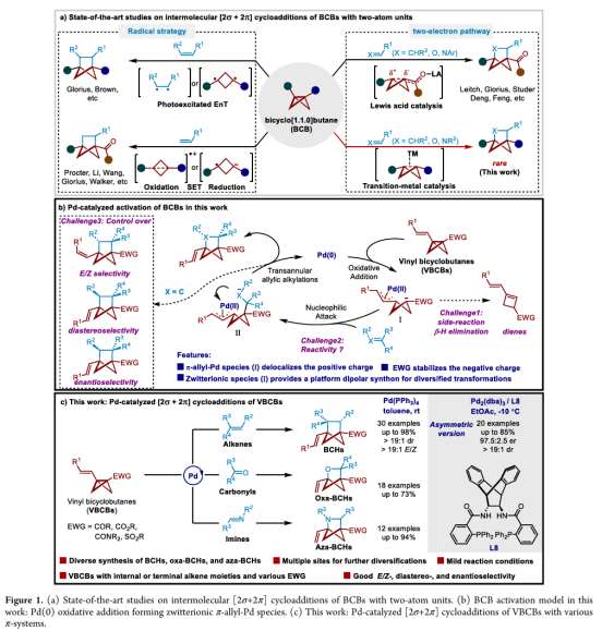 双环[1.1.0]丁烷(BCBs)由于其桥头C - C键的多样反应性一直受到合成化学家的关注。其与多种合成子的环加成反应已然成为一条合成双环[n.1.1]烷烃的简洁高效的方法,包括与卡宾的(3 + 1)环化反应合成BCPs和与环丙烷的(3 + 3)环加成反应合成BCHeps。此外,BCBs与不饱和体系的[2s+2p]环加成反应是构建BCHs的重要策略,已有的报道主要采用如下三种活化策略:能量转移过程的光环加成反应、单电子转移过程的自由基环化反应以及Lewis 酸催化的偶极环加成反应(Figure 1A)。前两种策略会产生自由基物种,这限制了底物的兼容性。后者可以与各种体系如烯烃、醛、烯酮和吲哚进行环加成反应。然而它仅限于含有羰基的BCB底物。过渡金属催化由于其广泛的应用范围和便捷性,是现代有机合成的基本合成工具之一。然而,由于其催化过程中可能会形成金属卡宾物种或者发生其他开环反应,因此将过渡金属催化活化BCB策略应用于这些桥环化合物的构建具有挑战性。