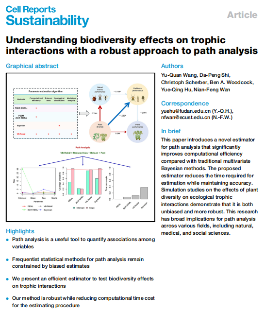 万年峰课题组,联合我国、英国、德国的科研人员,在Cell新子刊—Cell Reports Sustainability上以Articles形式发表了题为“Understanding biodiversity effects on trophic interactions with a robust approach to path analysis”的原始创新研究成果。