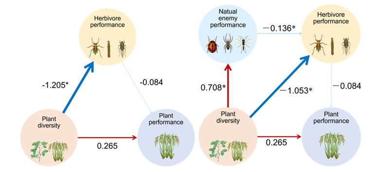 通过VB-RobM分析各营养级功能群之间的关系,得到如下结果:(1)在无天敌的作用下,植物多样性能够抑制植食性昆虫,使其危害降低,而植食性昆虫下降促进了植物的产量与品质;(2)在植物、植食性昆虫、天敌共存的三营养级功能群中,多样化的植物增加了天敌多样性,增强了天敌对植食性昆虫的控制效果。后续的路径分析进一步验证了植物可能通过“植物多样性→植食性昆虫→植物生产力”“植物多样性→天敌→植食性昆虫→植物生产力”这两条路径间接地提高植物生产力。这些结论也验证了万年峰课题组近些年提出的营养级联动理论(Nature Plants, 2020)、联动链理论(Current Biology, 2024a)、下行控害假说(Nature Communications, 2022)、天敌假说(Journal of Applied Ecology, 2022)等生物多样性控害理论。
