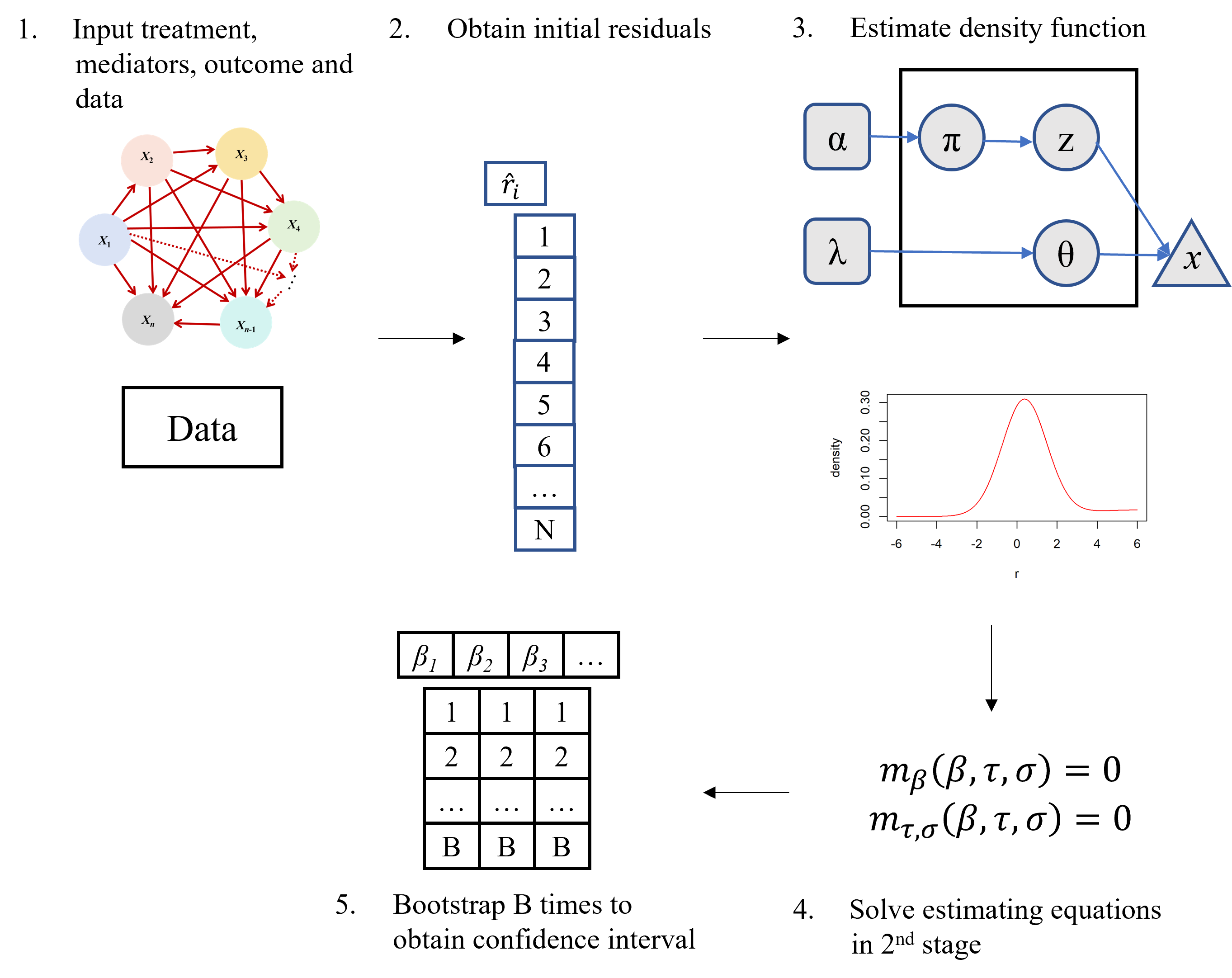 具体来说,VB-RobM 方法包括以下五个步骤:(1)输入数据并指定变量之间的路径;(2)利用回归分析获得每条路径的路径系数和回归残差的初始估计;(3)通过狄利克雷过程混合模型(DPMM)估计残差的密度函数以及稳健函数的一阶矩和二阶矩;(4)求解鲁棒估计方程获得路径系数的二阶段估计;(5)通过自助抽样法对中介效应进行统计推断。