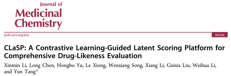 唐赟教授团队在Journal of Medicinal Chemistry上发表了题为“CLaSP: A Contrastive Learning-Guided Latent Scoring Platform for Comprehensive Drug-Likeness Evaluation”的研究论文。该研究报道一个全新的成药性预测模型,通过整合ADMET性质、理化性质以及可合成性,为候选药物分子带来更综合、更具解释性的成药性评分。